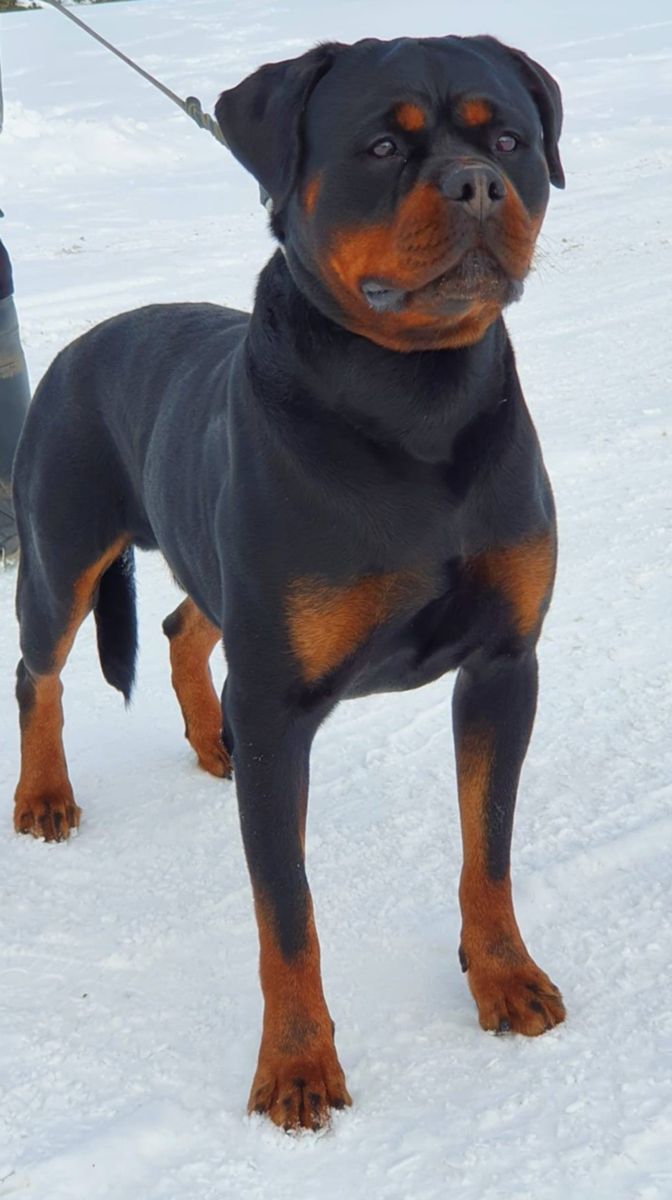 “Big, good substitute, strong bones, alert, friendly, strong excellent head, big ears a little hi set, correctly carried, deep dark brown eyes 1A, mostly dark month pigment, corners a little bit light, slightly open lips, strong neck, a little loose skin, very good developed chest, fore hand very good angulated but sometimes to close, right pasture slightly soft, tight paws, straight back with slightly slopping croup, tail properly carried very good underline, rear is correctly placed very good angulated, correct coat, red/brown very good spread markings, very good movement. Head square and typey, cheek bones are pronounces, bone strength is strong, temperament very confident, alert, and good stable minded.”